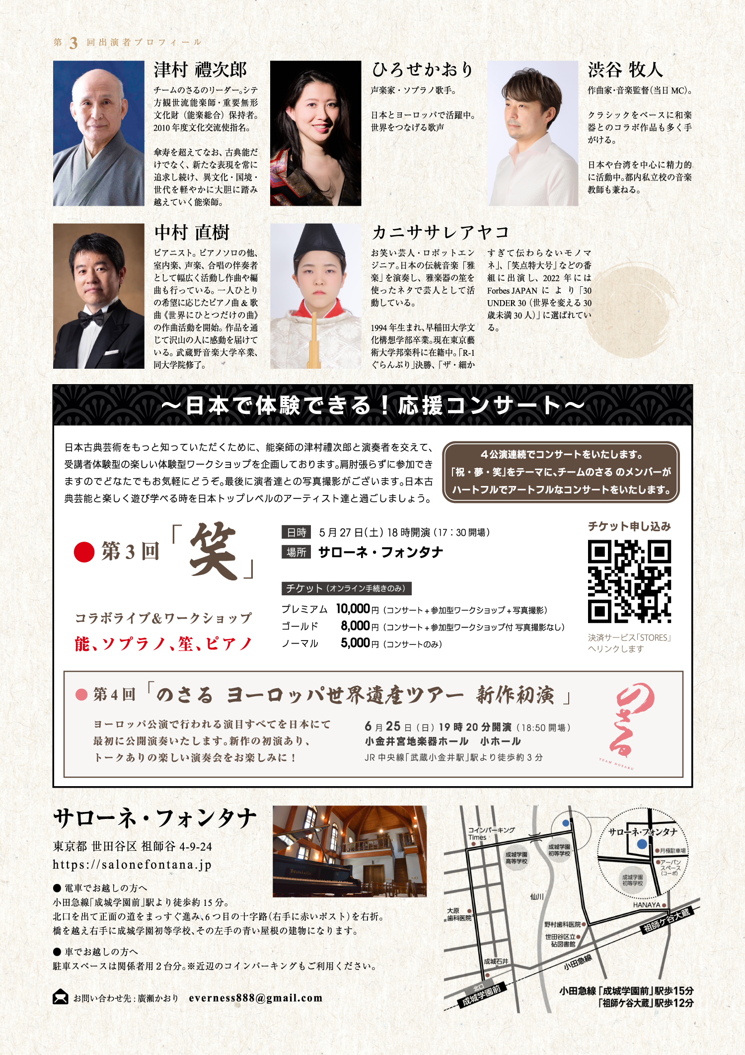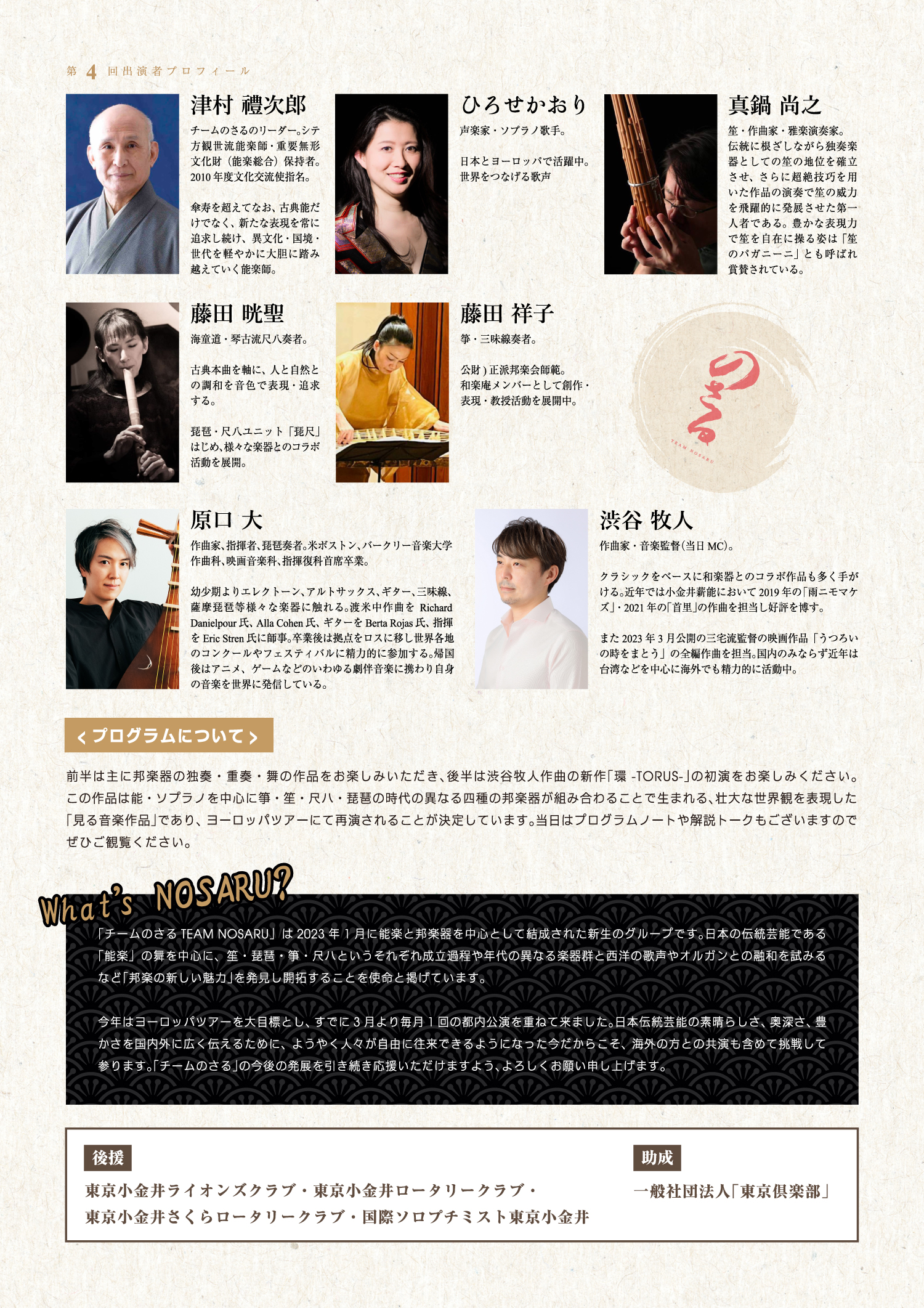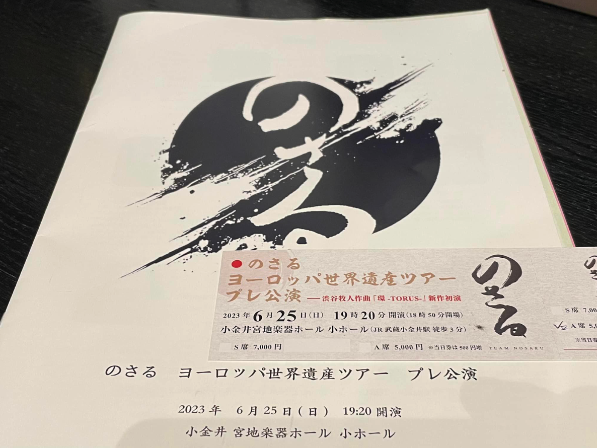 またゲストとしてピアニストの中村直樹さんにもご出演いただきますので、どうぞお楽しみください。それでは「のさる」をぜひ今後とも応援いただき、コンサートをお楽しみください。なおこのコンサート収益はヨーロッパツアーのための準備資金として活用させていただきます。