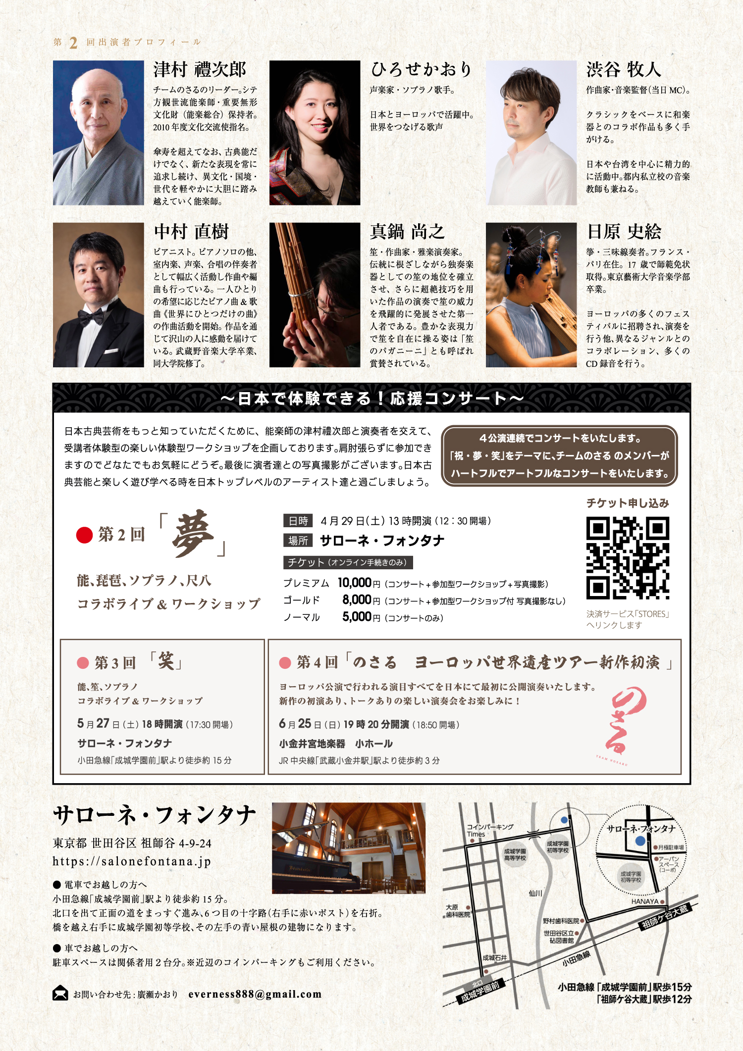第2回のタイトルの「夢」とは、そもそも能における世阿弥の提唱した夢幻能、諸行無常の精神とも結びついている私たちの文化のアイデンティのひとつを指します。また私たちのヨーロッパツアーそのものも大きな「夢」であるという、複数の意味をかけております。決して夢物語で終わることなく、しっかりとツアーを実現してきます、という決意表明ともいえます。メンバーは海外在住勢も含めて10名弱おりますが、今回はフランス在住でこのために帰国いただいた、箏奏者の日原さん、また卓越した笙奏者であり作曲家である真鍋さんのお二人のメンバーにご出演いただき、我々「のさる」の夢のリアルを感じていただければと願っております。